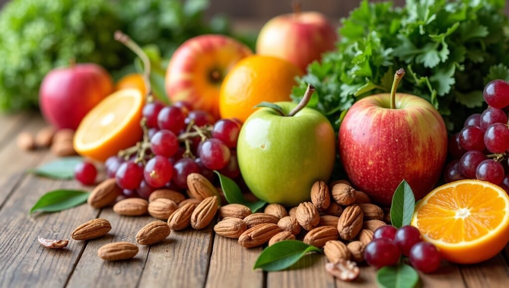 - ताजे फल (संतरा, कीवी, आड़ू, बेरीज): विटामिन C, E और A से भरपूर।