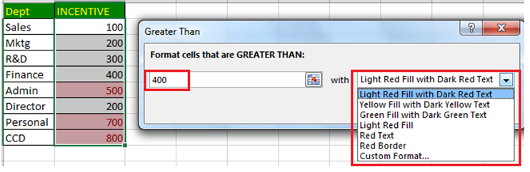 यदि आप चाहते है कि किसी रो में आपके द्वारा दी गई वेल्यू से अधिक वेल्यू वाली सेलो का कलर अलग हो, तो आप इस विकल्प का चयन कर सकते है। जैसा की चित्र मे दिया गया है Greater Than के बॉक्स मे हमने 400 टाइप किया तो 400 से ऊपर के amount Highlight हो गया साइड मे दिये गए बॉक्स से कलर change भी कर सकते है ।
