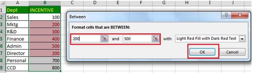 इस विकल्प का उपयोग तब किया जाता है जब आप किसी Range (सीमा) के बीच आने वाले मानों (Values) वाली Cells को Highlight करना चाहते हैं।