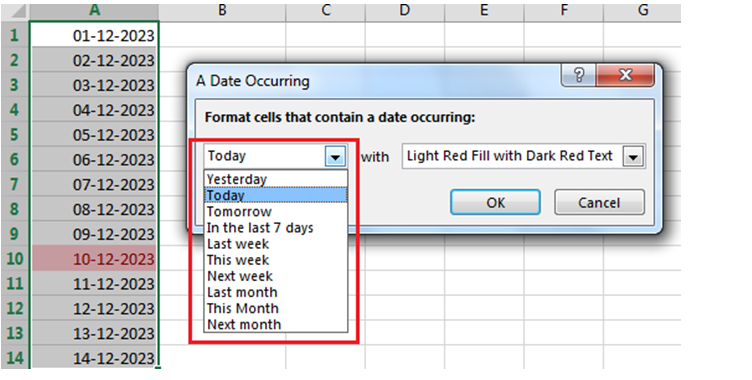 इस विकल्प का उपयोग तब किया जाता है जब आप अपने डाटा में किसी विशेष दिनांक (Date) वाली Cells को Highlight करना चाहते हैं।