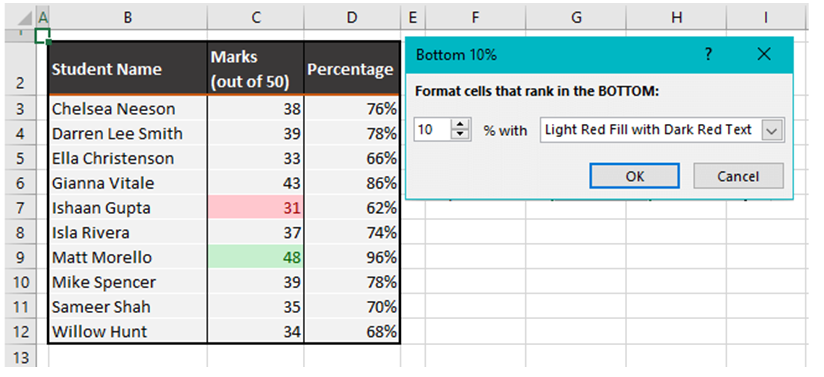 अर्थात्, Excel अपने आप आपके Data में से Bottom 10% Values (यानि सबसे कम प्रतिशत वाले Data) को पहचानकर