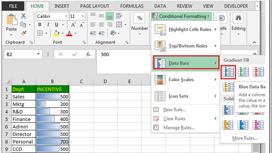 इस विकल्प का उपयोग तब किया जाता है जब आप Excel में दिए गए संख्यात्मक (Numeric) Data को एक “Bar Format” में दिखाना चाहते हैं।