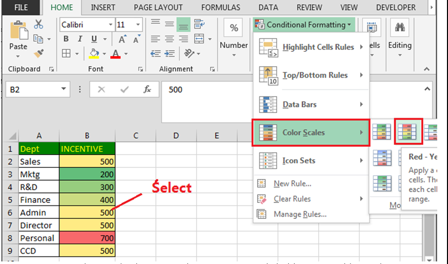 - जाएँ → Home Tab → Styles Group → Conditional Formatting