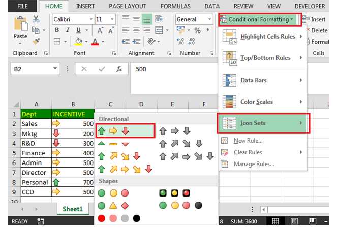 अर्थात्, आपके Data के मान (Value) के अनुसार Excel हर Cell के आगे एक Icon (जैसे ↑, ↓, ⚫, ★) दिखाता है।