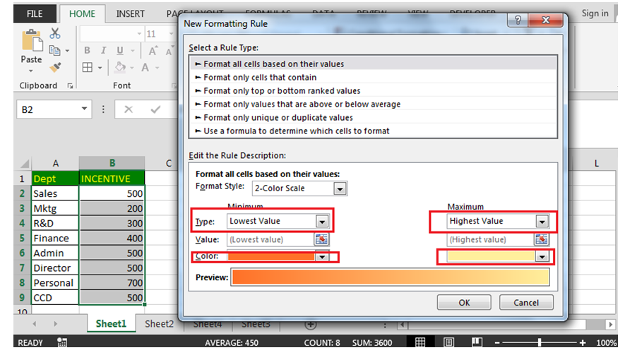 - Excel आपके चुने हुए Range में सबसे छोटी और सबसे बड़ी Value को पहचानता है।