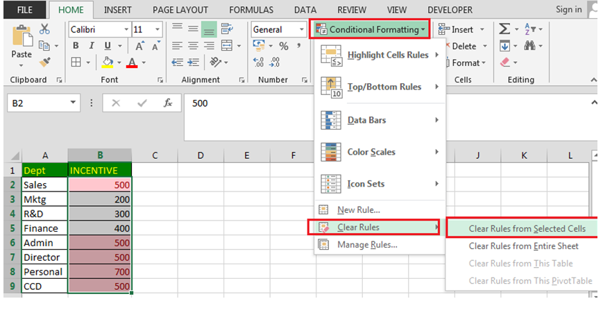 - Clear Rules सभी Highlighting, Color Scales, Data Bars, Icon Sets आदि को हटाने का कार्य करता है।
