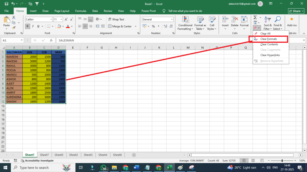 рдЕрдЧрд░ рдЖрдкрдиреЗ рдХрд┐рд╕реА рд╕реЗрд▓ рдХрд╛ рдЯреЗрдХреНрд╕реНрдЯ Bold рдФрд░ Red Color рдХрд┐рдпрд╛ рд╣реИ, рдФрд░ рдЕрдм рдХреЗрд╡рд▓ рдлрд╝реЙрд░реНрдореЗрдЯ рд╣рдЯрд╛рдирд╛ рдЪрд╛рд╣рддреЗ рд╣реИрдВ, рддреЛ Clear Formats рдЪреБрдиреЗрдВред рдЯреЗрдХреНрд╕реНрдЯ рд╡рд╣реА рд░рд╣реЗрдЧрд╛, рд▓реЗрдХрд┐рди рдЙрд╕рдХреА рдлрд╝реЙрд░реНрдореЗрдЯрд┐рдВрдЧ рд╣рдЯ рдЬрд╛рдПрдЧреАред
